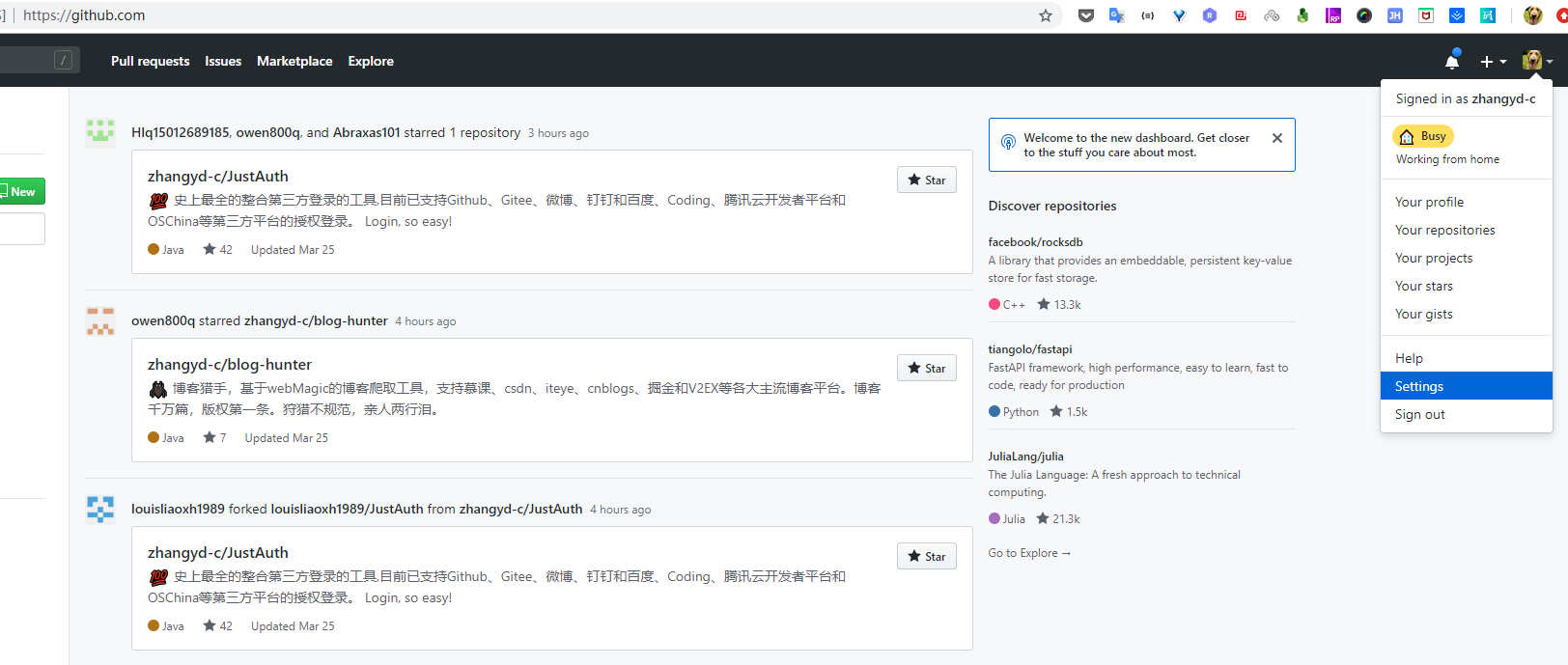 进入通过右上角进入个人设置页:https://github.com/settings/profile file 然后进入第三方应用页面:https://github.com/settings/developers file