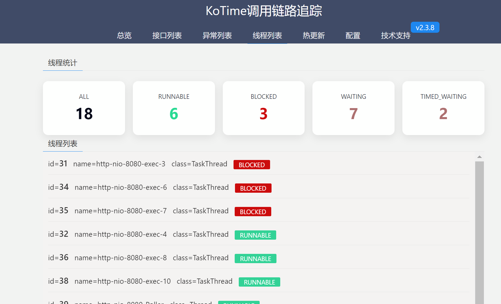v2.3.9开始加入了线程管理功能,可以统计线程状态和查看线程堆栈信息