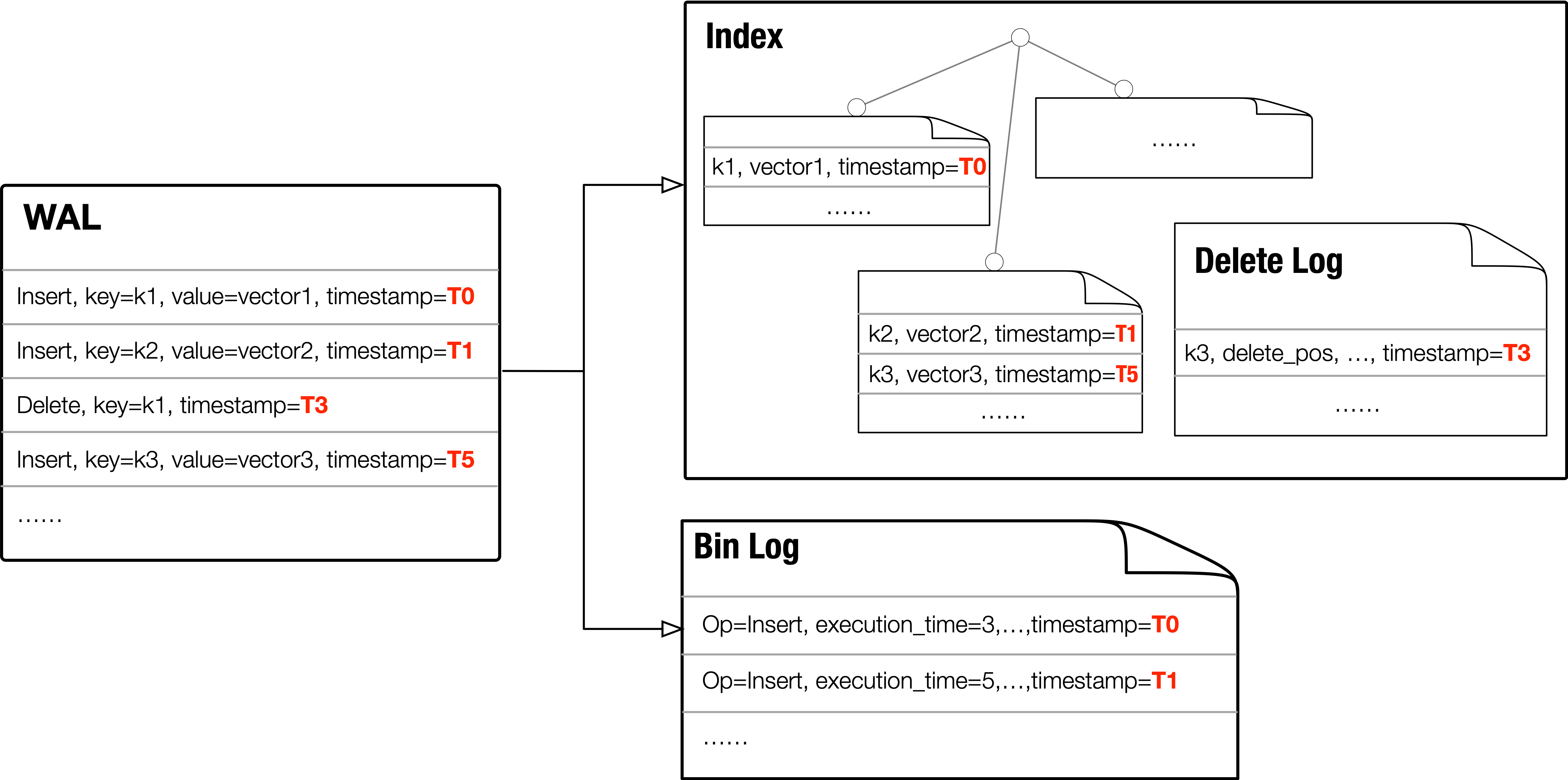 Each of the WAL is attached with a timestamp, which is the time when the log is sent to the hash bucket. Binlog records, table rows, index cells will also keep that timestamp. In this way, different data forms can offer consistent snapshots for a given time T. For example, requests such as "fetch binlogs before T for point-in-time recovery", "get the row with primary key K at time T", "launch a similarity search at time T for vector V" perform on binlog, index respectively. Though different data forms of these three requests are performed, they observe identical snapshots, namely all the state changes before T.