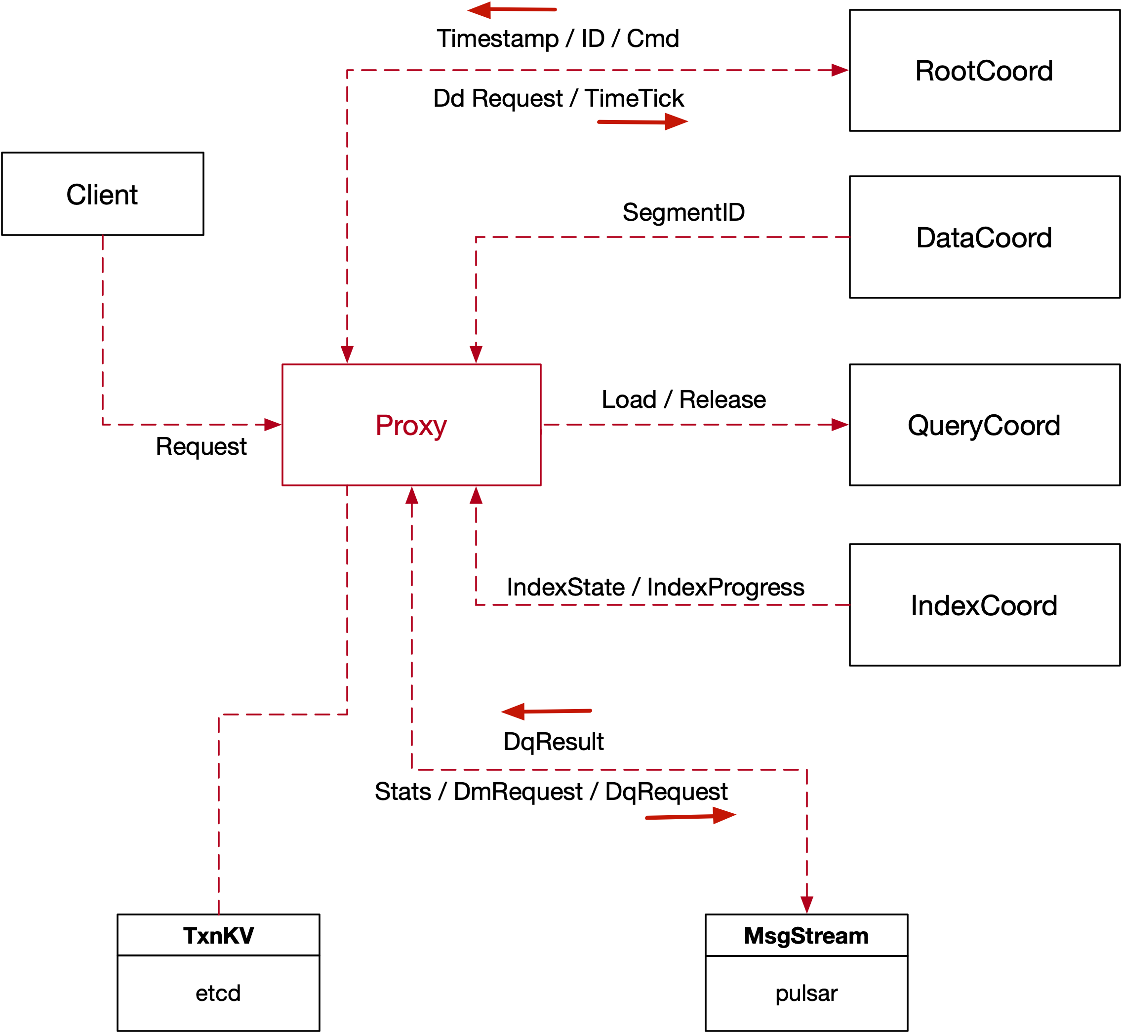 ## 5. Proxy #### 5.0 Proxy Service Interface ```go type ProxyService interface { Component TimeTickProvider RegisterNode(ctx context.Context, request *proxypb.RegisterNodeRequest) (*proxypb.RegisterNodeResponse, error) InvalidateCollectionMetaCache(ctx context.Context, request *proxypb.InvalidateCollMetaCacheRequest) (*commonpb.Status, error) } ``` - _MsgBase_ ```go type MsgBase struct { MsgType MsgType MsgID UniqueID Timestamp uint64 SourceID UniqueID } ``` - _RegisterNode_ ```go type Address struct { Ip string Port int64 } type RegisterNodeRequest struct { Base *commonpb.MsgBase Address string Port int64 } type InitParams struct { NodeID UniqueID StartParams []*commonpb.KeyValuePair } type RegisterNodeResponse struct { InitParams *internalpb.InitParams Status *commonpb.Status } ``` - _InvalidateCollectionMetaCache_ ```go type InvalidateCollMetaCacheRequest struct { Base *commonpb.MsgBase DbName string CollectionName string } ``` #### 5.1 Proxy Node Interface ```go type Proxy interface { Component // InvalidateCollectionMetaCache notifies Proxy to clear all the meta cache of specific collection. InvalidateCollectionMetaCache(ctx context.Context, request *proxypb.InvalidateCollMetaCacheRequest) (*commonpb.Status, error) } ``` - _InvalidateCollectionMetaCache_ ```go type InvalidateCollMetaCacheRequest struct { Base *commonpb.MsgBase DbName string CollectionName string } ``` #### 5.2 Milvus Service Interface Proxy also implements Milvus Service interface to receive client grpc call. ```go type MilvusService interface { // CreateCollection creates a collection CreateCollection(ctx context.Context, request *milvuspb.CreateCollectionRequest) (*commonpb.Status, error) DropCollection(ctx context.Context, request *milvuspb.DropCollectionRequest) (*commonpb.Status, error) HasCollection(ctx context.Context, request *milvuspb.HasCollectionRequest) (*milvuspb.BoolResponse, error) LoadCollection(ctx context.Context, request *milvuspb.LoadCollectionRequest) (*commonpb.Status, error) ReleaseCollection(ctx context.Context, request *milvuspb.ReleaseCollectionRequest) (*commonpb.Status, error) DescribeCollection(ctx context.Context, request *milvuspb.DescribeCollectionRequest) (*milvuspb.DescribeCollectionResponse, error) GetCollectionStatistics(ctx context.Context, request *milvuspb.CollectionStatsRequest) (*milvuspb.CollectionStatsResponse, error) ShowCollections(ctx context.Context, request *milvuspb.ShowCollectionRequest) (*milvuspb.ShowCollectionResponse, error) CreateAlias(ctx context.Context, request *milvuspb.CreateAliasRequest) (*commonpb.Status, error) DropAlias(ctx context.Context, request *milvuspb.DropAliasRequest) (*commonpb.Status, error) AlterAlias(ctx context.Context, request *milvuspb.AlterAliasRequest) (*commonpb.Status, error) CreatePartition(ctx context.Context, request *milvuspb.CreatePartitionRequest) (*commonpb.Status, error) DropPartition(ctx context.Context, request *milvuspb.DropPartitionRequest) (*commonpb.Status, error) HasPartition(ctx context.Context, request *milvuspb.HasPartitionRequest) (*milvuspb.BoolResponse, error) LoadPartitions(ctx context.Context, request *milvuspb.LoadPartitionRequest) (*commonpb.Status, error) ReleasePartitions(ctx context.Context, request *milvuspb.ReleasePartitionRequest) (*commonpb.Status, error) GetPartitionStatistics(ctx context.Context, request *milvuspb.PartitionStatsRequest) (*milvuspb.PartitionStatsResponse, error) ShowPartitions(ctx context.Context, request *milvuspb.ShowPartitionRequest) (*milvuspb.ShowPartitionResponse, error) CreateIndex(ctx context.Context, request *milvuspb.CreateIndexRequest) (*commonpb.Status, error) DescribeIndex(ctx context.Context, request *milvuspb.DescribeIndexRequest) (*milvuspb.DescribeIndexResponse, error) GetIndexState(ctx context.Context, request *milvuspb.IndexStateRequest) (*milvuspb.IndexStateResponse, error) DropIndex(ctx context.Context, request *milvuspb.DropIndexRequest) (*commonpb.Status, error) Insert(ctx context.Context, request *milvuspb.InsertRequest) (*milvuspb.InsertResponse, error) Search(ctx context.Context, request *milvuspb.SearchRequest) (*milvuspb.SearchResults, error) Flush(ctx context.Context, request *milvuspb.FlushRequest) (*commonpb.Status, error) GetDdChannel(ctx context.Context, request *commonpb.Empty) (*milvuspb.StringResponse, error) GetQuerySegmentInfo(ctx context.Context, req *milvuspb.QuerySegmentInfoRequest) (*milvuspb.QuerySegmentInfoResponse, error) GetPersistentSegmentInfo(ctx context.Context, req *milvuspb.PersistentSegmentInfoRequest) (*milvuspb.PersistentSegmentInfoResponse, error) GetQuerySegmentInfo(ctx context.Context, in *GetQuerySegmentInfoRequest, opts ...grpc.CallOption) (*GetQuerySegmentInfoResponse, error) } } ``` - _CreateCollection_ See _Master API_ for detailed definitions. - _DropCollection_ See _Master API_ for detailed definitions. - _HasCollection_ See _Master API_ for detailed definitions. - _LoadCollection_ ```go type LoadCollectionRequest struct { Base *commonpb.MsgBase DbName string CollectionName string } ``` - _ReleaseCollection_ ```go type ReleaseCollectionRequest struct { Base *commonpb.MsgBase DbName string CollectionName string } ``` - _DescribeCollection_ ```go type DescribeCollectionRequest struct { Base *commonpb.MsgBase DbName string CollectionName string CollectionID int64 TimeStamp uint64 } ``` See _Master API_ for detailed definitions. - _GetCollectionStatisticsRequest_ ```go type GetCollectionStatisticsRequest struct { Base *commonpb.MsgBase DbName string CollectionName string } ``` See _Master API_ for detailed definitions. - _ShowCollections_ See _Master API_ for detailed definitions. - _CreateAlias_ See _Master API_ for detailed definitions. - _DropAlias_ See _Master API_ for detailed definitions. - _AlterAlias_ See _Master API_ for detailed definitions. - _CreatePartition_ See _Master API_ for detailed definitions. - _DropPartition_ See _Master API_ for detailed definitions. - _HasPartition_ See _Master API_ for detailed defini