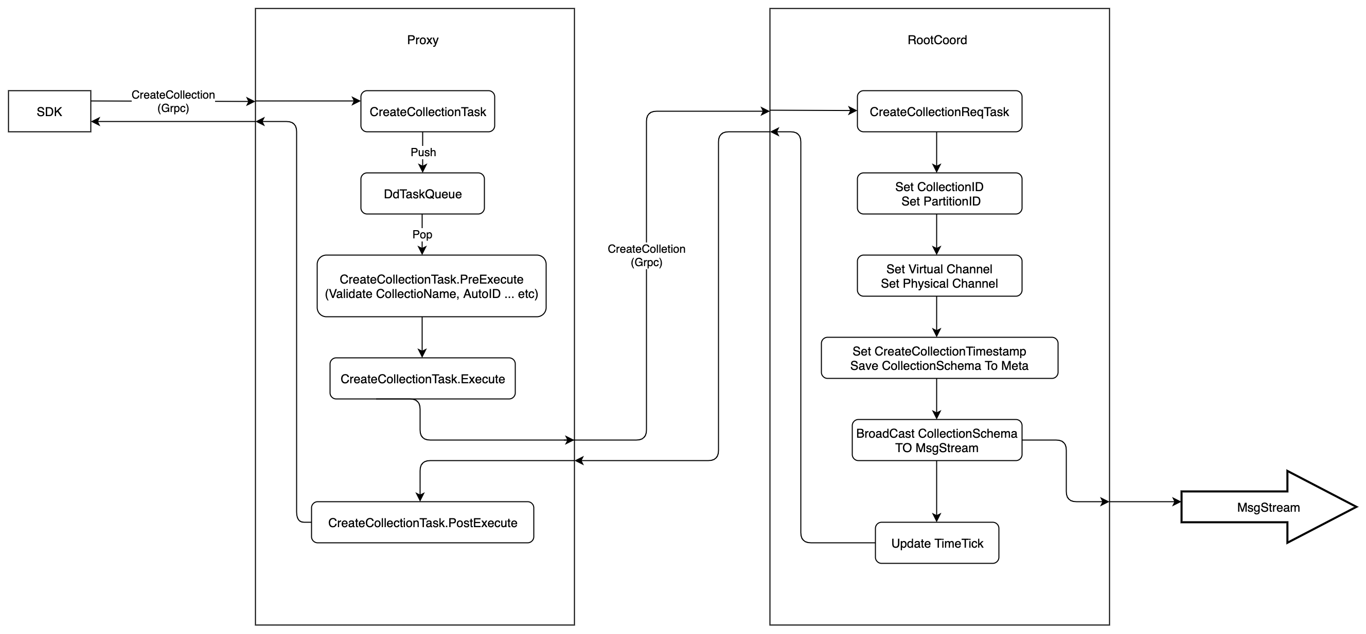 1. When receiving the CreateCollection request, Proxy would wrap this request into CreateCollectionTask, and pushes this task into DdTaskQueue queue. After that, Proxy would call WaitToFinish method to wait until the task is finished.