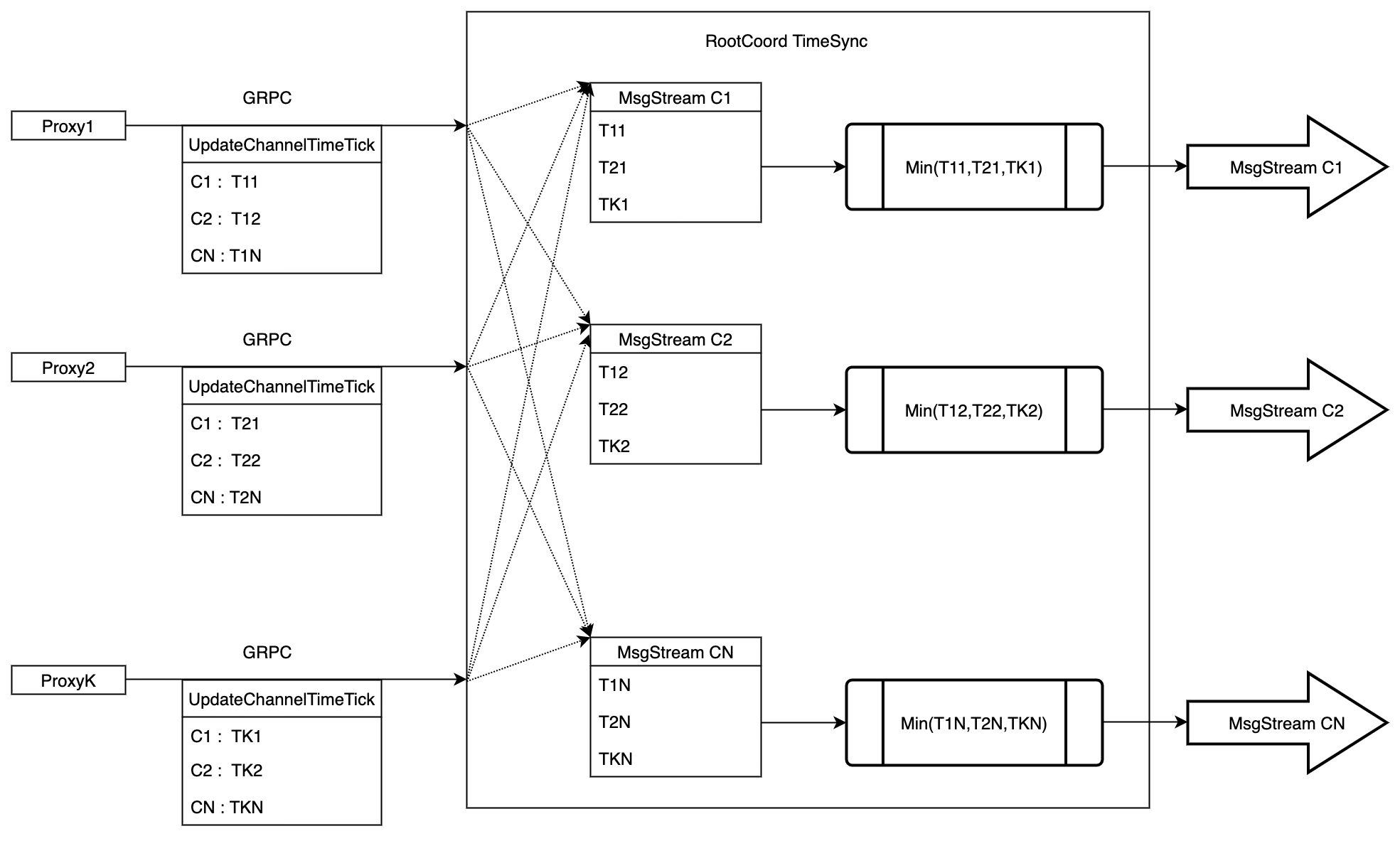Proxywill periodically report its latest timestamp of everyMsgStreamtoRootCoord; the default interval is200ms - For each