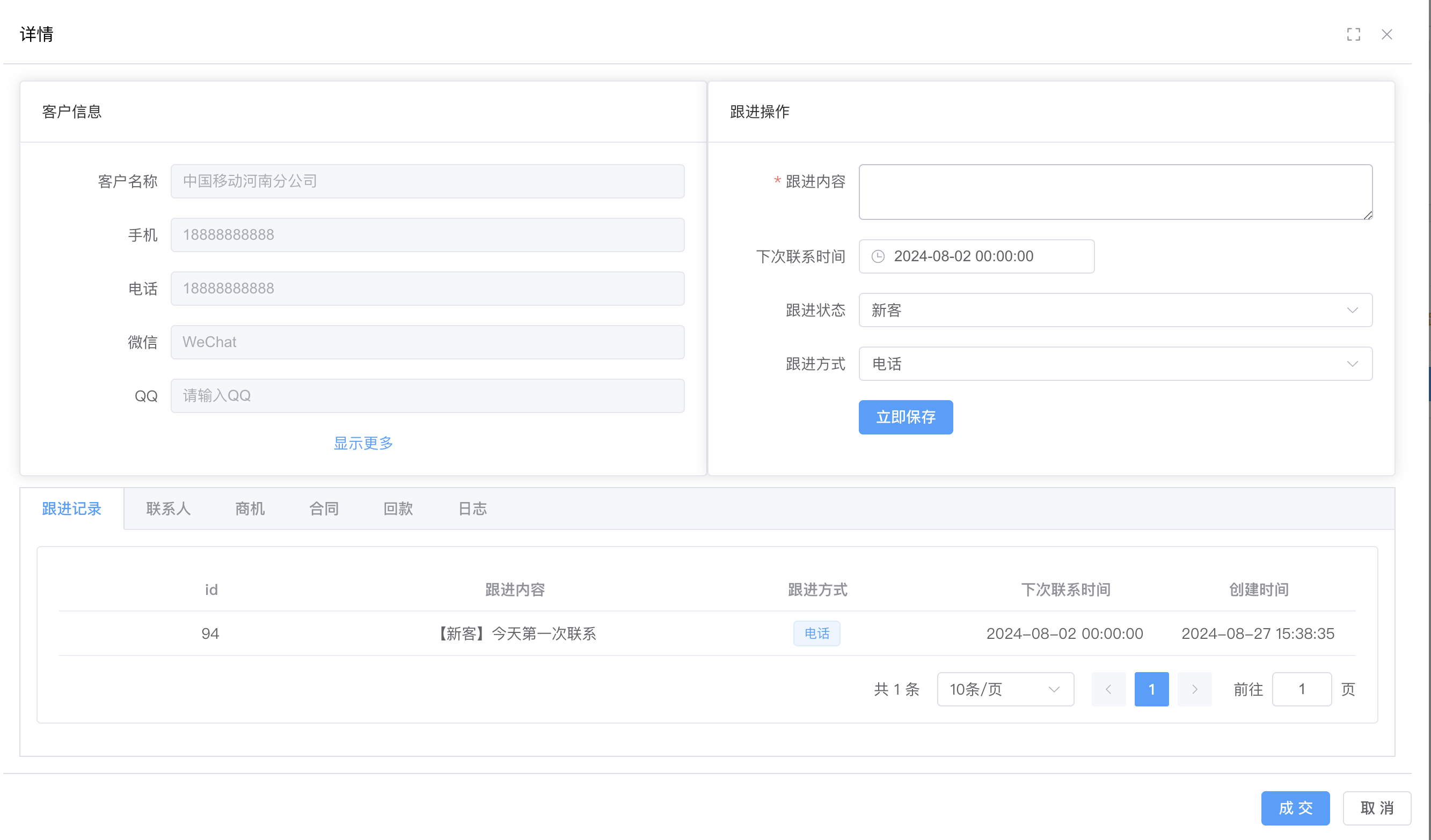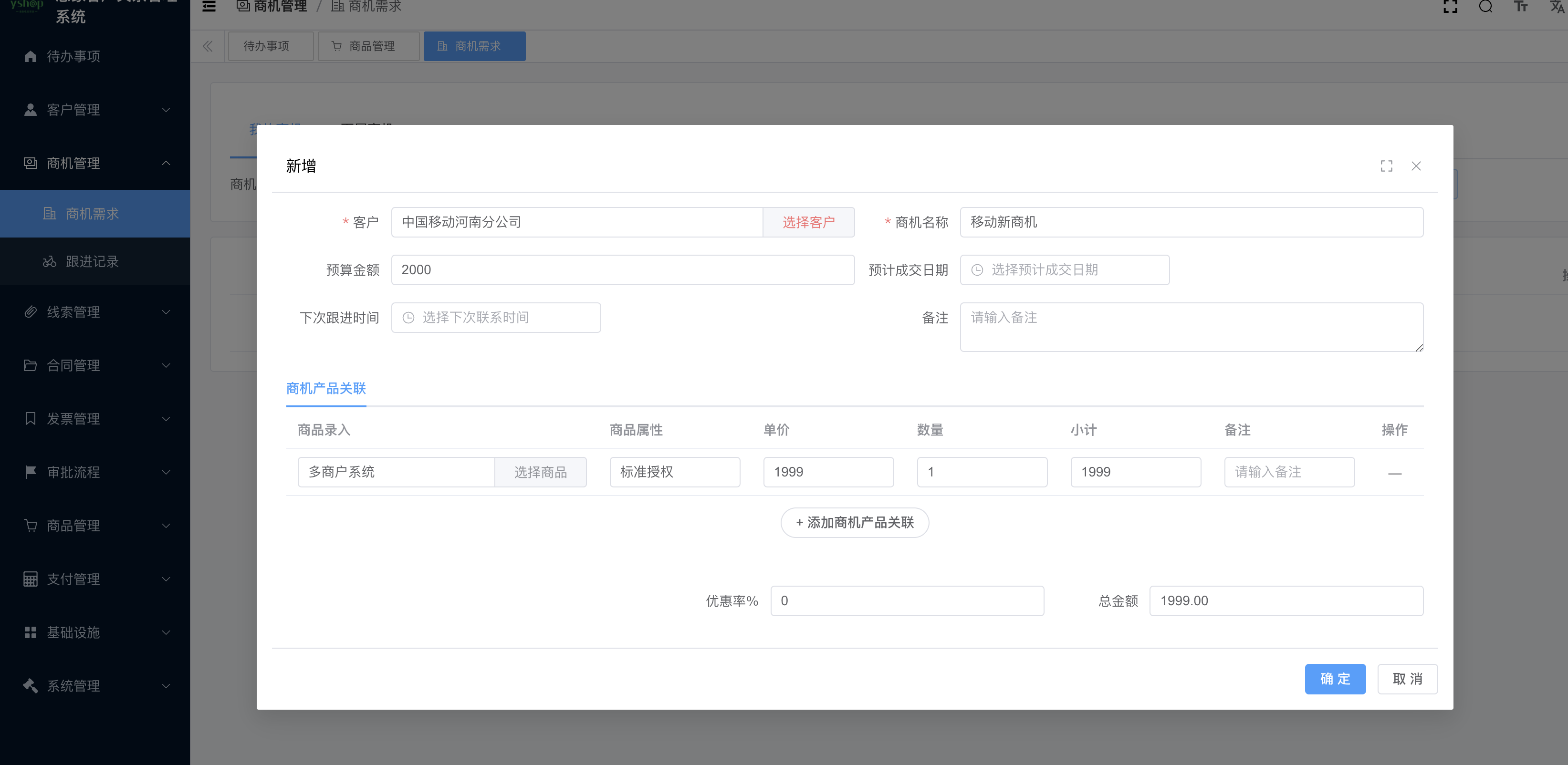 商机管理 商机需求、跟进、产品添加、查看详情、发邮件、发短信等