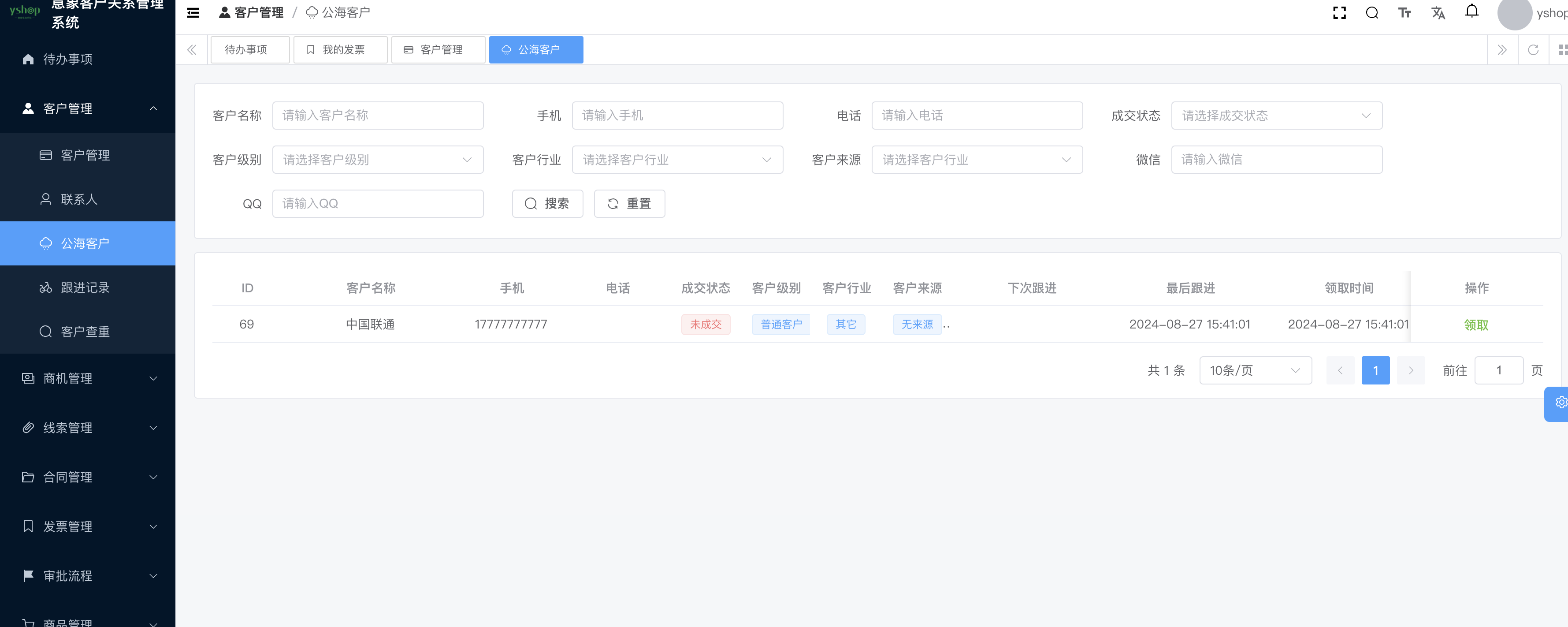 yshop-crm意象客户关系管理系统,专门为企业销售团队量身定制的工具,能够有效的管理跟进客户提供销售业绩,技术: SpringBoot3、Spring Security OAuth2、MybatisPlus、SpringSecurity、jwt、redis、Vue3的前后端分离的系统